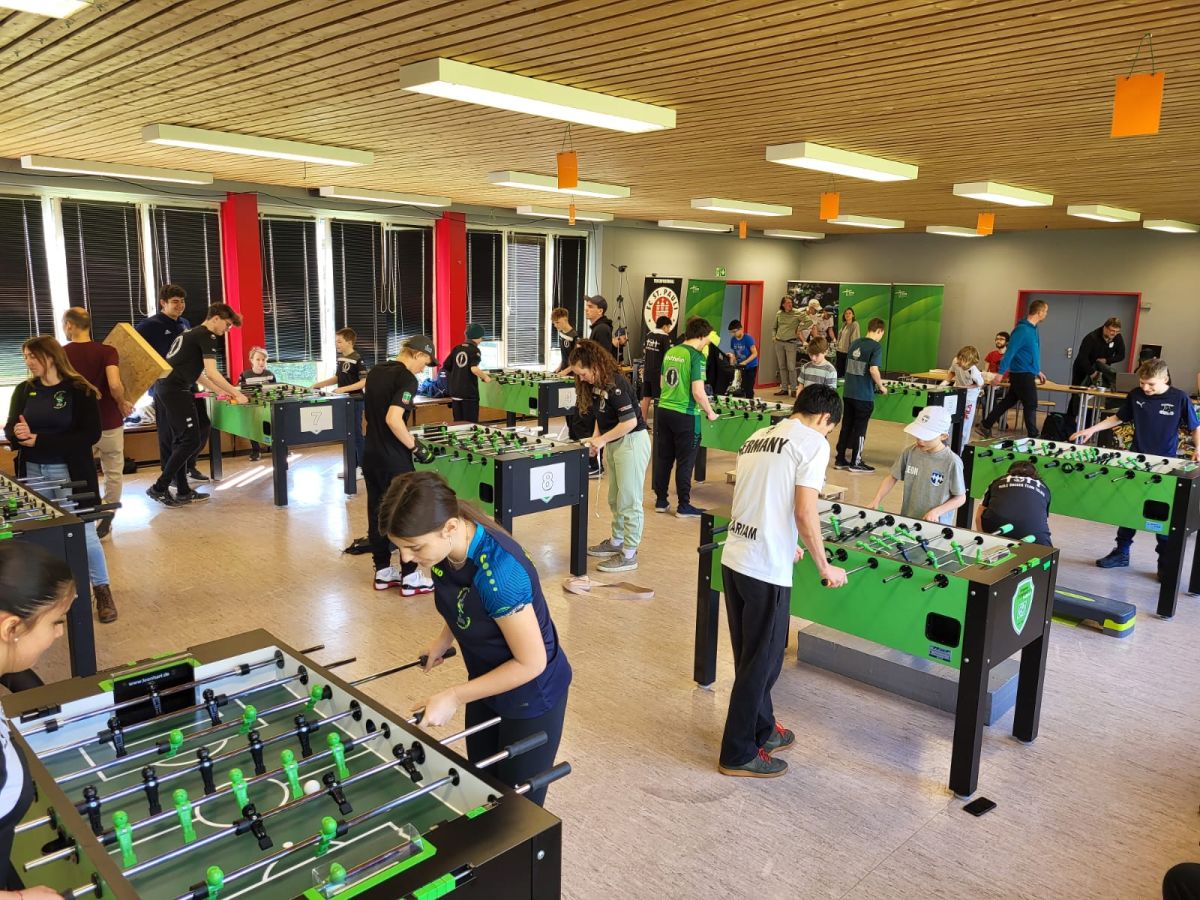 Ca. 40 Kinder und Jugendliche spielten auf 12 Leonhart-Tischen am Samstag und Sonntag die Gewinner:innen aus -- wobei jeweils Alters- und Kategorie-übergreifend eine gemeinsame Vorrunde gespielt wurde, bevor es um Gold, Silber und Bronze in den insgesamt 8 Disziplinen ging.